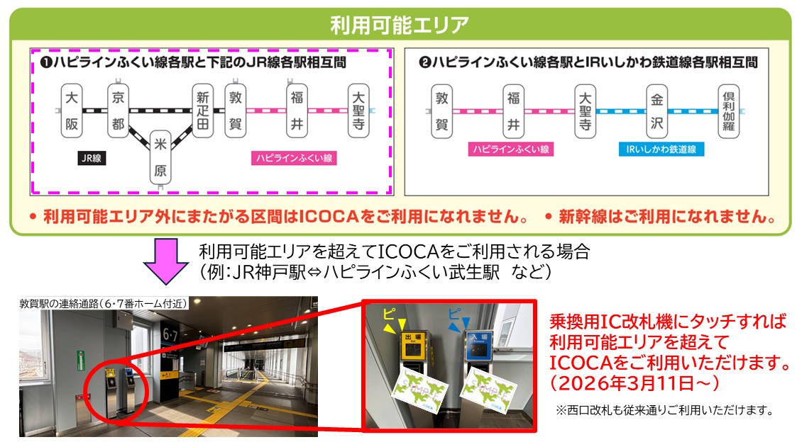 交通系ICカードを利用してハピライン線と他社線(JR線やIRいしかわ鉄道線)を乗り継ぐ場合、利用可能エリアを超えて交通系ICカードをご利用いただくことはできませんが、JR線については敦賀駅に設置されている「乗換用IC改札機」をご利用いただくことにより利用可能エリアを超えて交通系ICカードをご利用いただくことが可能です。