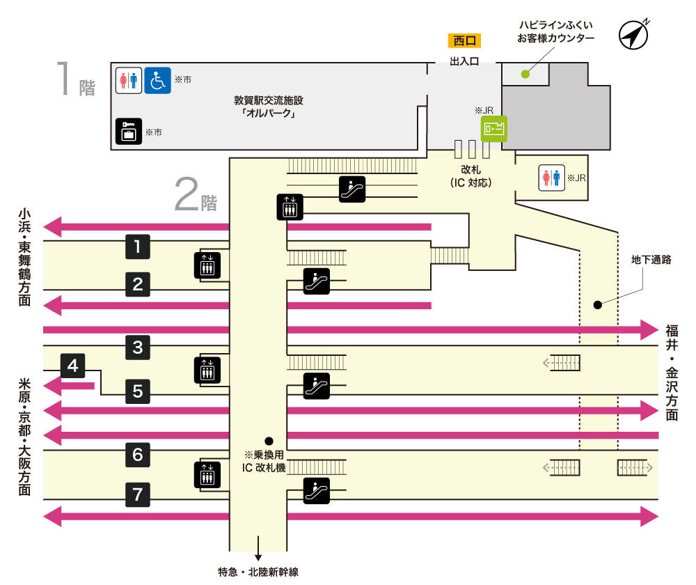 敦賀 つるが Tsuruga みなみいまじょう Minami-Imajo 駅情報 時刻表 構内図 駅の基本情報 住所 福井県敦賀市鉄輪町1丁目1-24 窓口営業時間 お客様カウンター 8:00~18:00(閉鎖時間11:50~13:10, 15:20~15:50) 設備・バリアフリー情報 券売機 ○ ※JR券売機でハピラインのきっぷ購入可 IC改札 ○ JRきっぷ販売 - 多目的トイレ ○ ※市 エレベーター ○ コインロッカー ○ ※市 駐車場 - ※周辺駐車場をご利用ください マップ 構内図 エスカレーター エレベーター コインロッカー トイレ 多目的トイレ 券売機 関連リンク 一覧へ戻る 南今庄駅