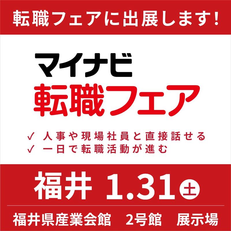 マイナビ転職フェア福井会場(1月31日(土))出展のお知らせ カテゴリ採用情報 UPDATE2026.01.20 1月31日(土)に開催される、マイナビ転職フェア福井会場に出展します。 第二新卒、社会人など、転職を希望されている方のご参加をお待ちしております! ぜひお気軽にお越しください。 日 時:1月31日(土)11:00~17:00(受付 10:00~16:30) 会 場:福井県産業会館 2号館 展示場 前の記事 一覧へ戻る 次の記事
